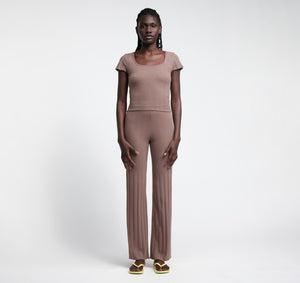 A sweet cropped tee in delicate pointelle, finished with a squared neckline, cap sleeves and a subtle ruffled hem. Light, breathable, and made with organic cotton.