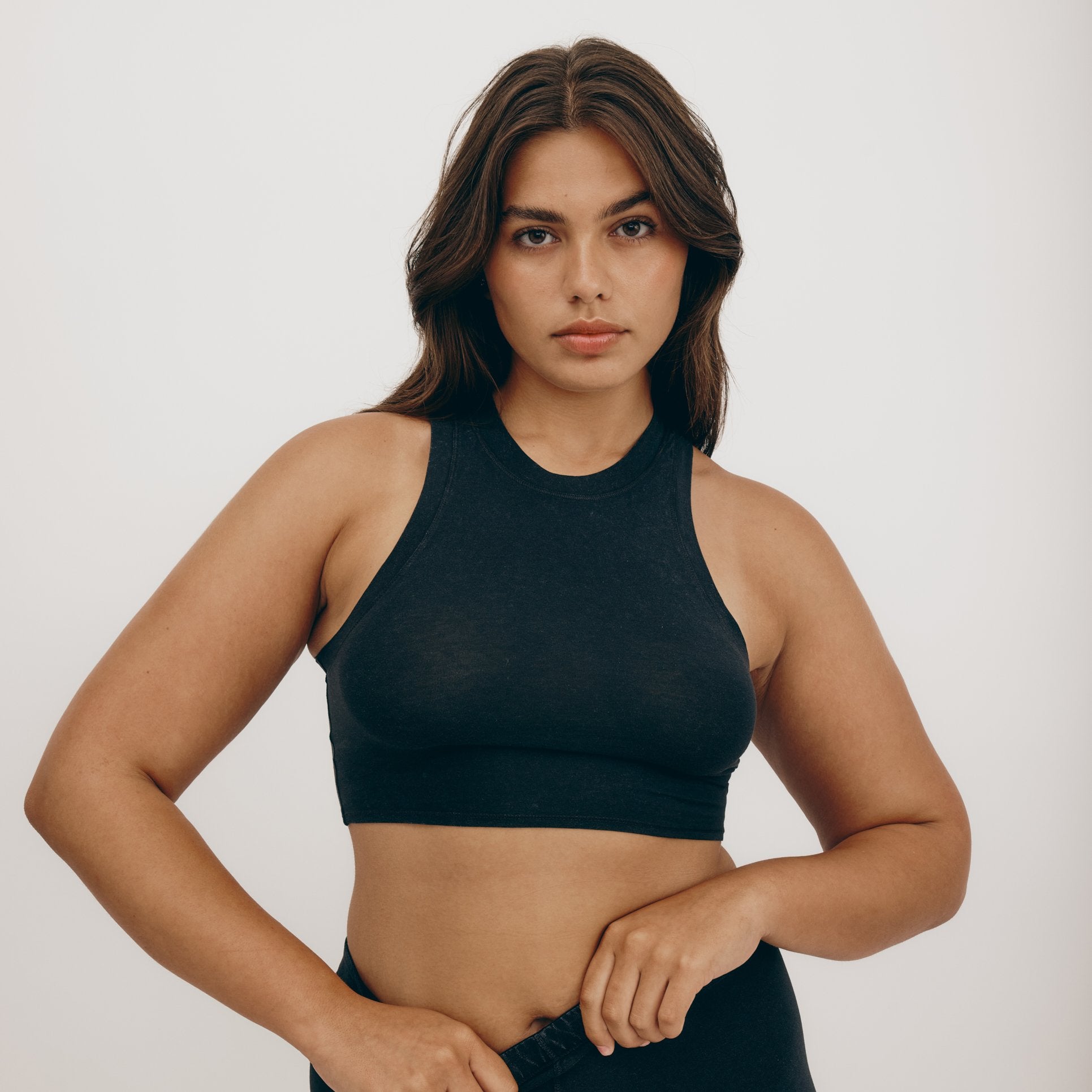 • Waist-grazing length with a racer-back and slightly higher, scoop neckline