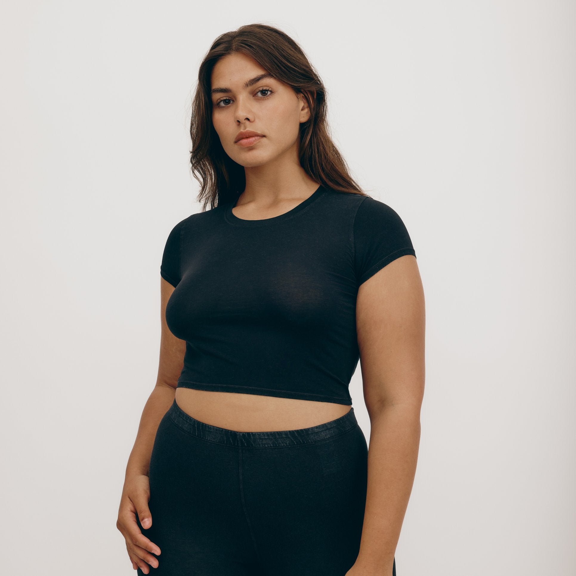 Stretch, baby! This soft, form-fitting tee made with 95% organic cotton features short sleeves and a baby tee fit.