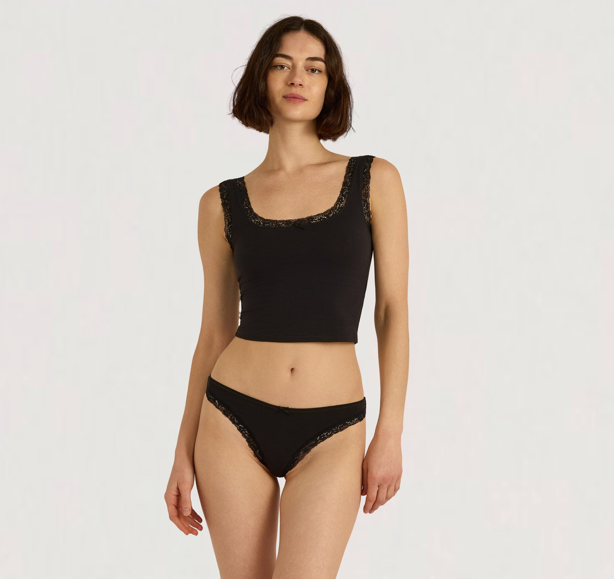 Cotton is a natural fiber that is commonly used for its breathability and softness. Using organic cotton instead of regular cotton has the potential to build soil health, as it is grown without the use of synthetic fertilizers. - Body: 90% Organic Cotton, 10% Elastane - Lace: 50% Recycled Polyamide, 39% Polyamide, 11% Elastane