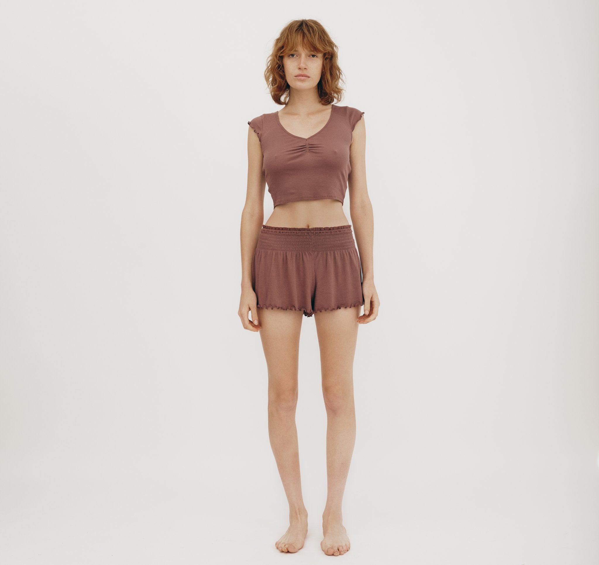 Gesmokte Mini-Shorts aus 95% Bio-Baumwolle 5x2 Ripp. Der geflatterte Saum sorgt für ein zartes Aussehen und Gefühl.