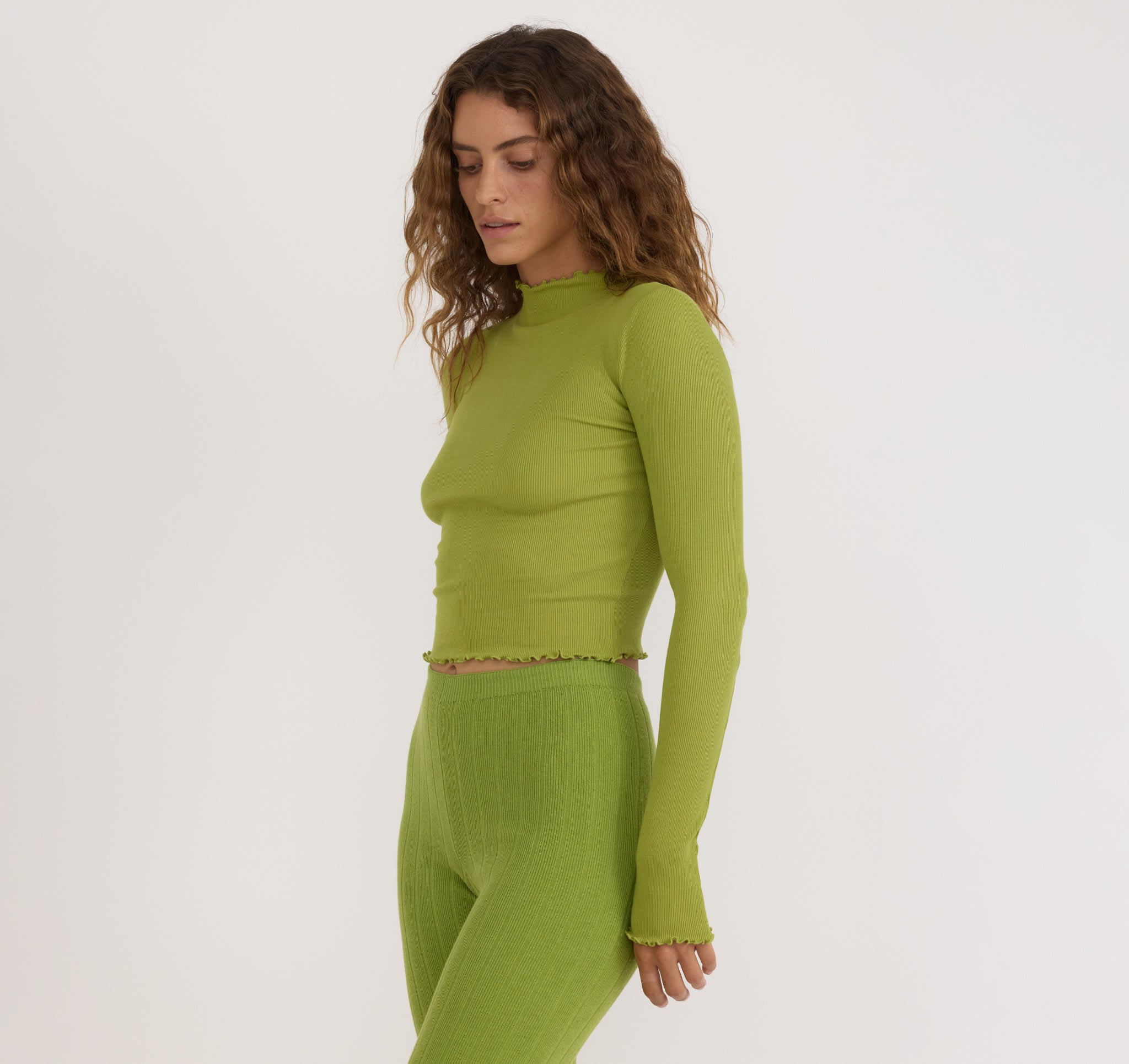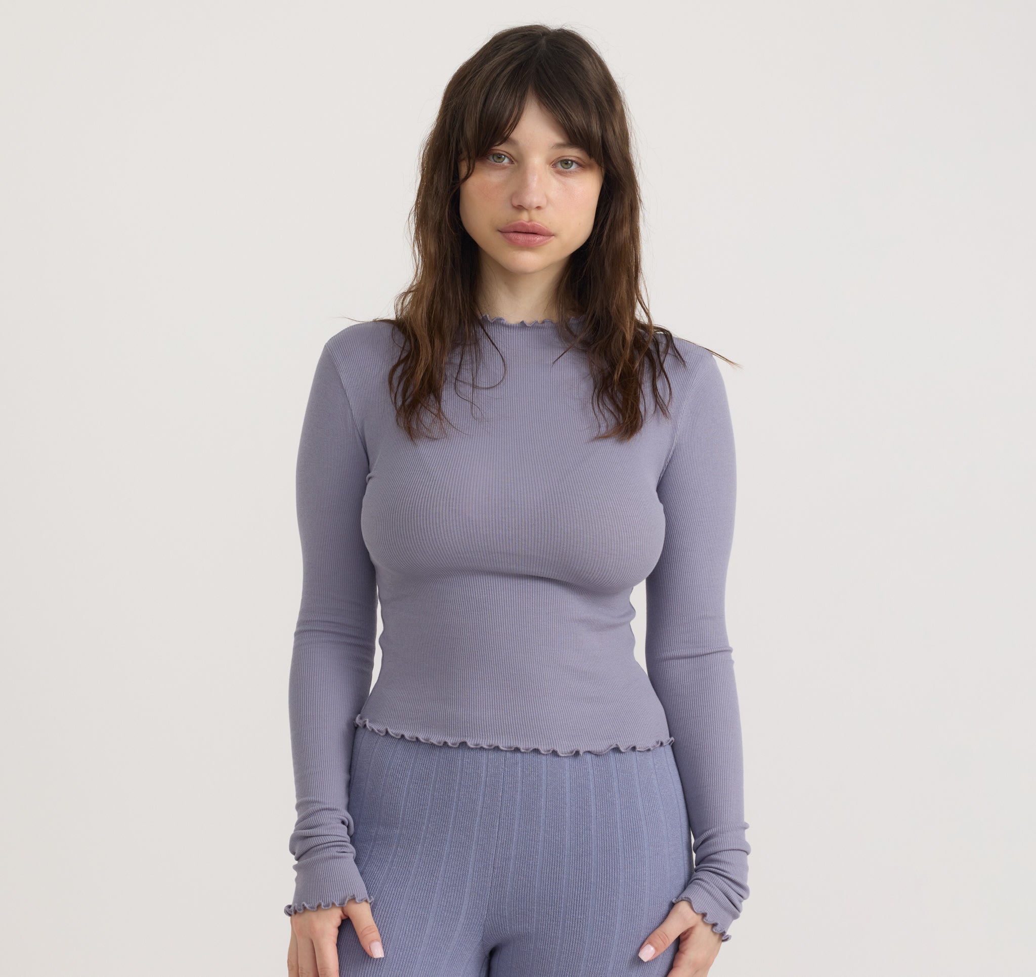 A long sleeve mock neck tee perfect for cozy nights in – and nights out as well. Made with 95% organic cotton to keep you comfortable, no matter your plans.