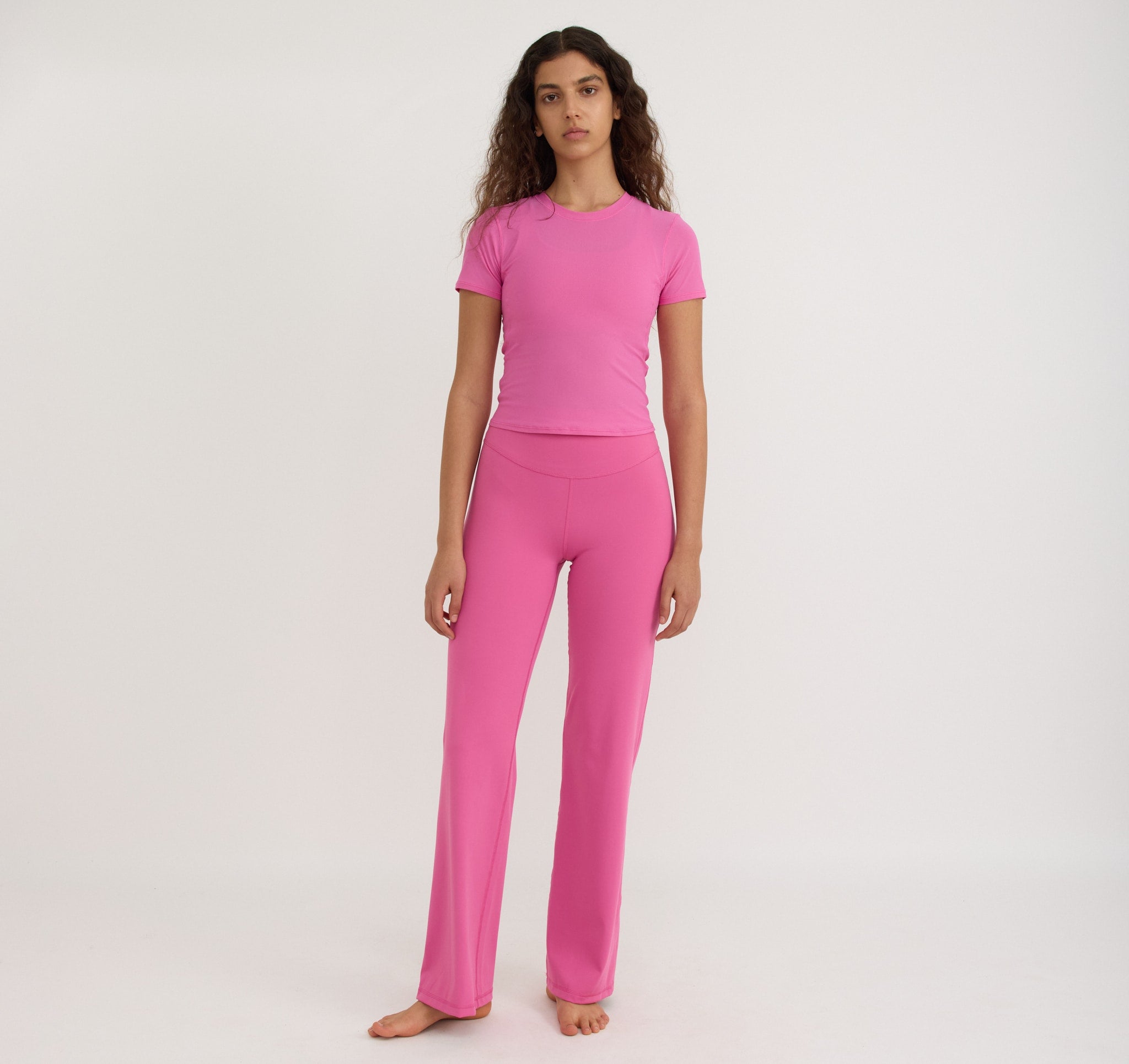 Less transparent than classic mesh, this semi-sheer fabric offers a sporty, casual look that can be layered over Active and Active Flow pieces or worn on its own. It features visible cover stitches for an active vibe and a tee design for versatile styling.