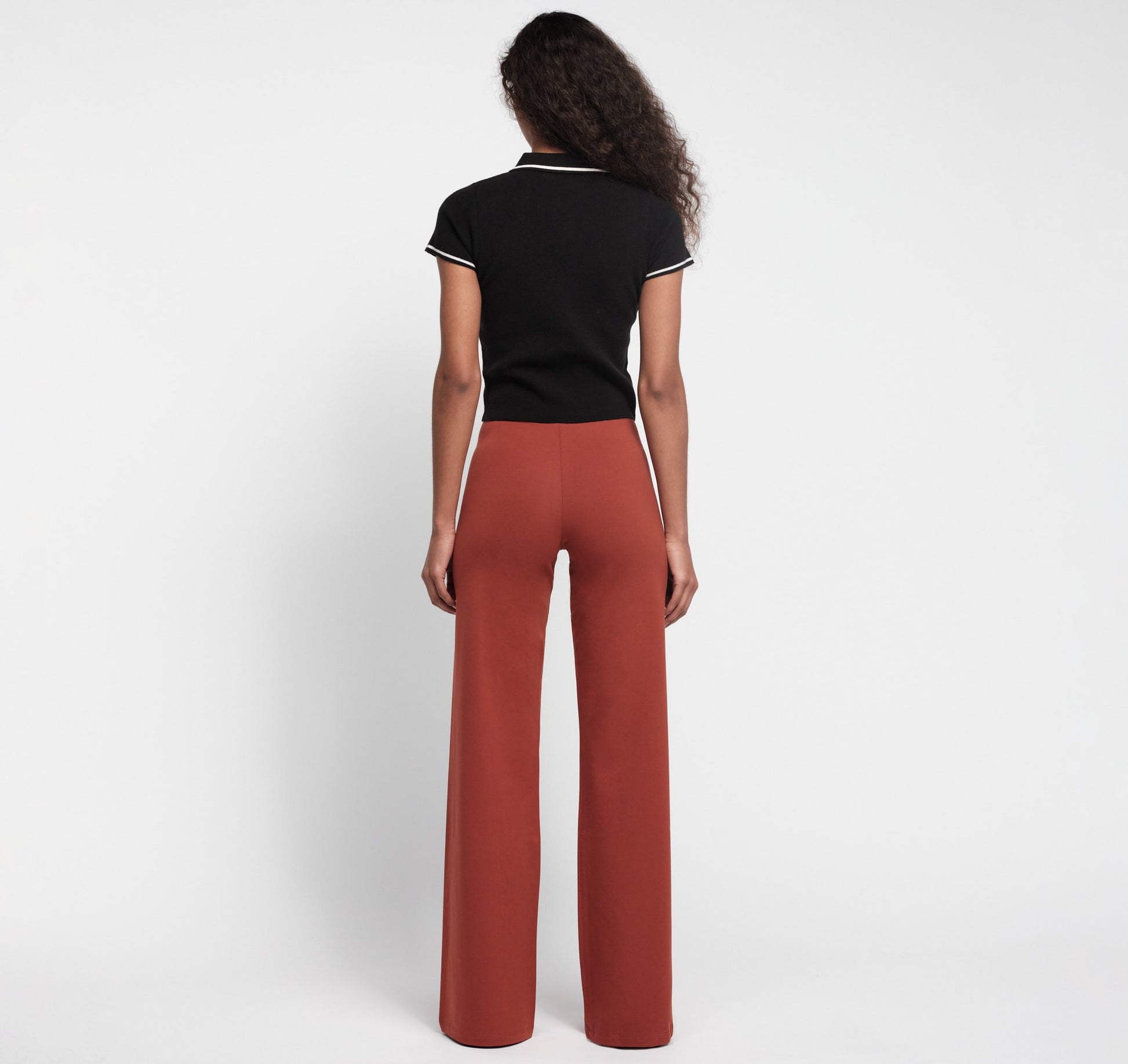 • High-waisted straight leg pants with a body-hugging fit.